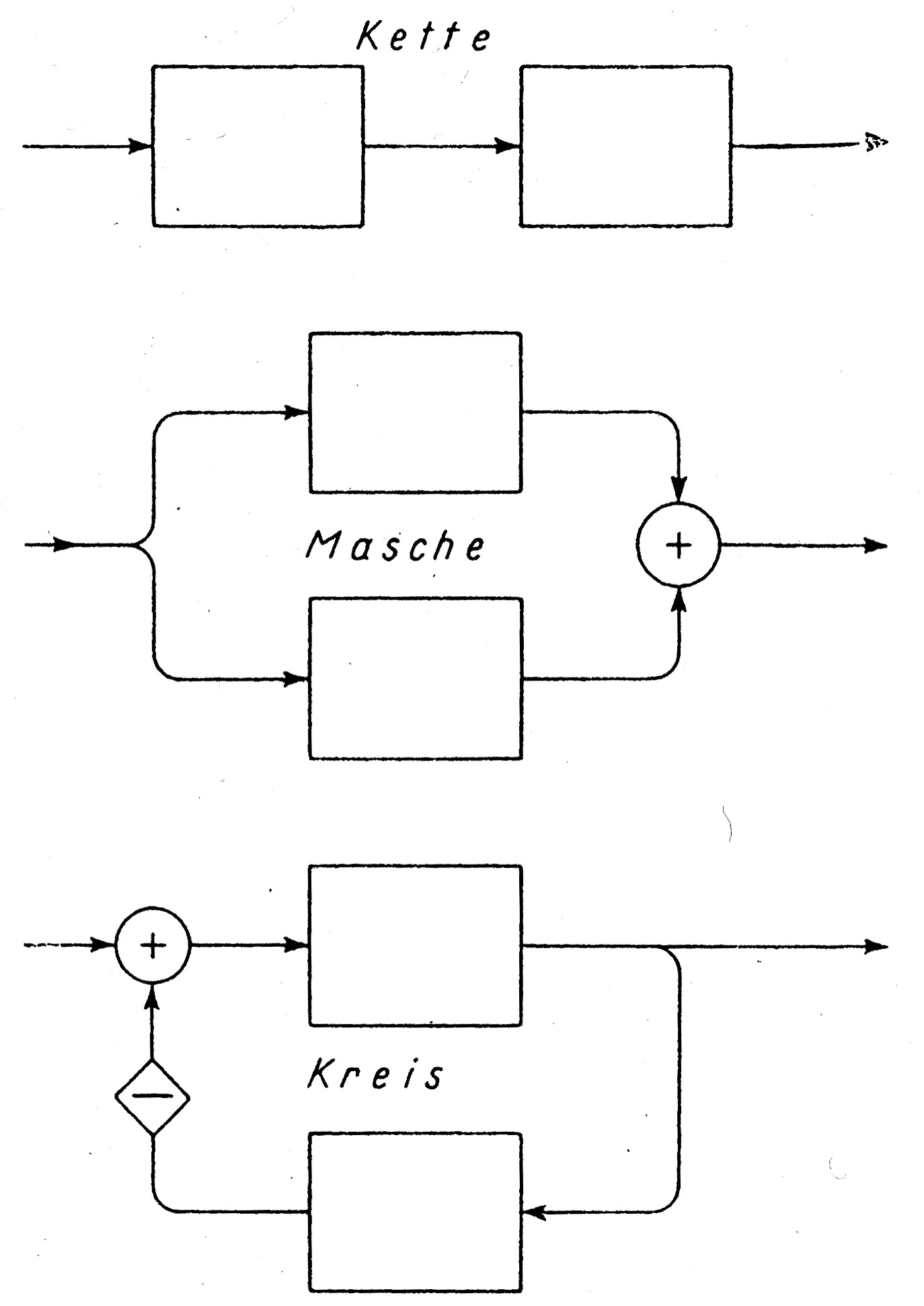 Diese beiden Systeme [einer biologischen und technischen Regelung] haben weder in ihrer äußeren Gestalt, noch in der Art ihres „Baumaterials“, noch hinsichtlich der physikalischen Mechanismen, auf denen die Funktion ihrer Elemente beruht, die geringste Ähnlichkeit miteinander. Trotzdem verhalten sie sich in den gleichen Situationen gleich. Das beruht darauf, daß sie aus Steuerkörpern zusammengesetzt sind und daß die Form der Verknüpfung der Steuerkörper bei beiden dieselbe ist, nämlich der Regelkreis. Für diesen Begriff, „Form der Verknüpfung der Steuerkörper“ braucht man eine kurze Bezeichnung. Ich möchte „Wirkungsgefüge“ vorschlagen. Die Zahl der theoretisch möglichen Wirkungsgefüge ist unbegrenzt. Aber es gibt – so viel ich sehe – nur drei Grundformen, aus denen sich alle anderen zusammensetzen lassen, die „Kette“, die „Masche“ und den „Kreis“ (Bild 9).