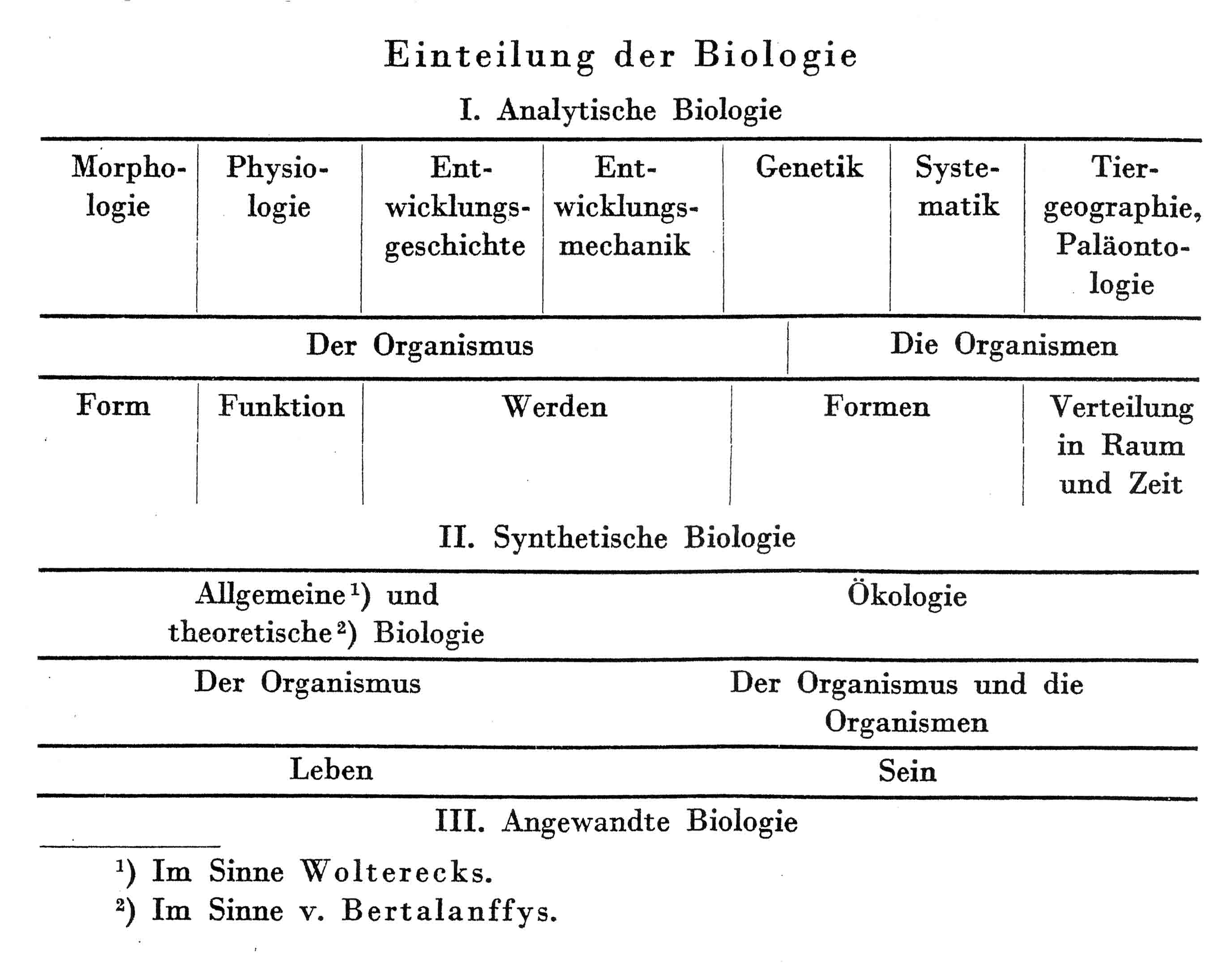 Da wir gerade auf das logische Verhältnis der biologischen Sondergebiete zueinander den Ton bei unserer Untersuchung legen wollen, können wir auch sagen, daß unser Denken jetzt dem System der Biologie gelten soll.