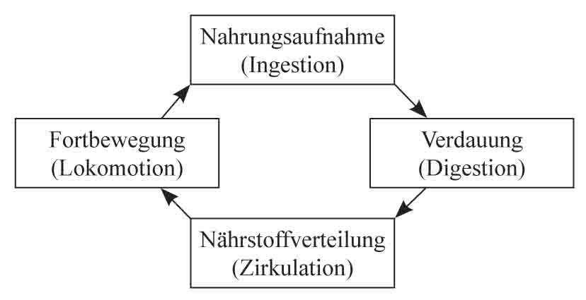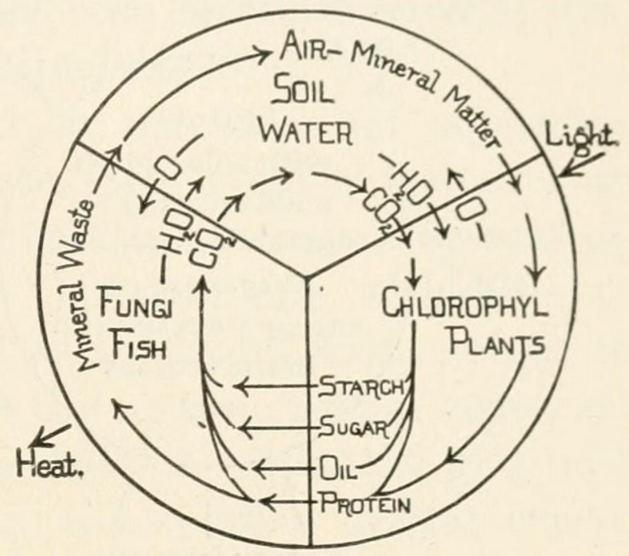 Die im Wasser gelösten organischen Stoffe werden in Pflanzenleibern organisiert, die Pflanze dient dem Tier als Nahrung, und das abgestorbene Tier gibt, indem es verwest, diese Stoffe dem Wasser wieder zurück; das ist das große allgemeine Schema dieses Kreislaufs: Aufbau, Wandlung, Abbau, wie im Einzelorganismus